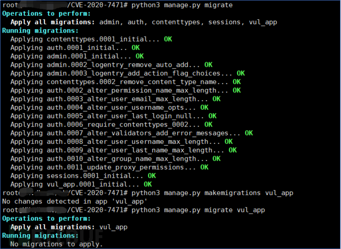 2.然后进入到CVE-2020-7471/sqlvul_projects/settings.py,修改数据库配置,如果之前安装postgres数据库使用的默认配置(包括密码),这里就不需修改任何任何配置