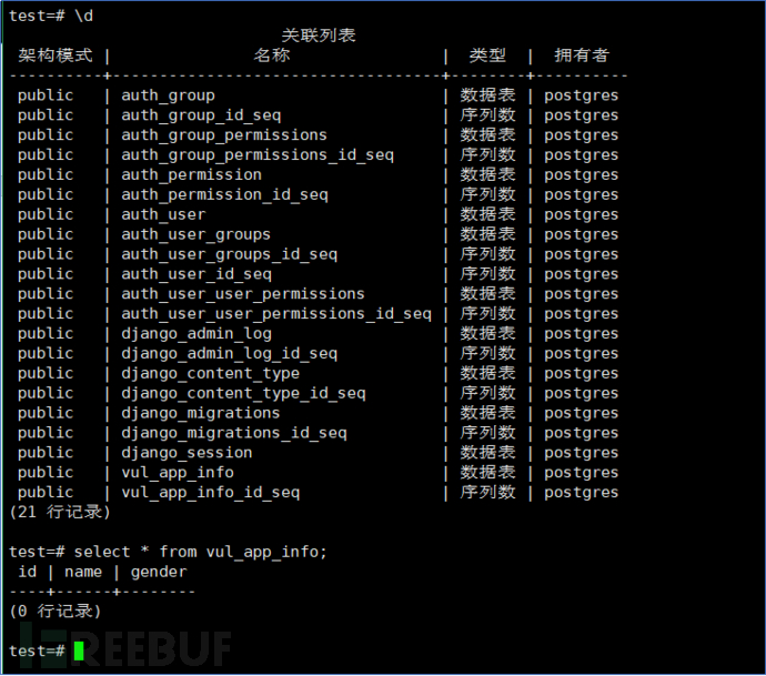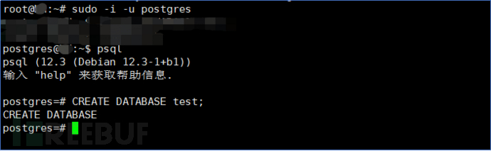 3.使用命令sudo -i -u postgres进入postgres账户,然后输入psql进入数据库,并创建测试数据库test。CREATE DATABASE test;